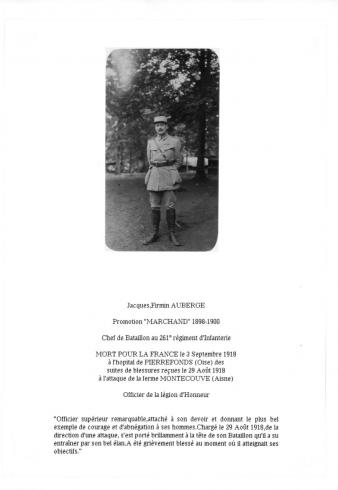 Citation(s) : Citation : "Officier supérieur remarquable, attaché à son devoir et donnant le plus bel exemple de courage et d'abnégation à ses hommes. Chargé, le 29 août 1918, de la direction d'une attaque, s'est porté brillamment à la tête de son bataillon qu'il a su entraîner par son bel élan. A été grièvement blessé au moment où il atteignait ses objectifs" .
